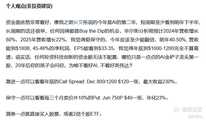 2月份就说了,我个人依然十分看好AI三年周期和英伟达年底$1200,现在看来$750的抄底很舒服,这周的财报要远超预期股价才有可能冲上$1000-1015, 难度不小。如果刚好有一些负面利空,能在$800左右加仓我也不会介意。