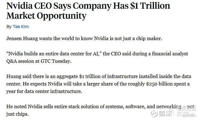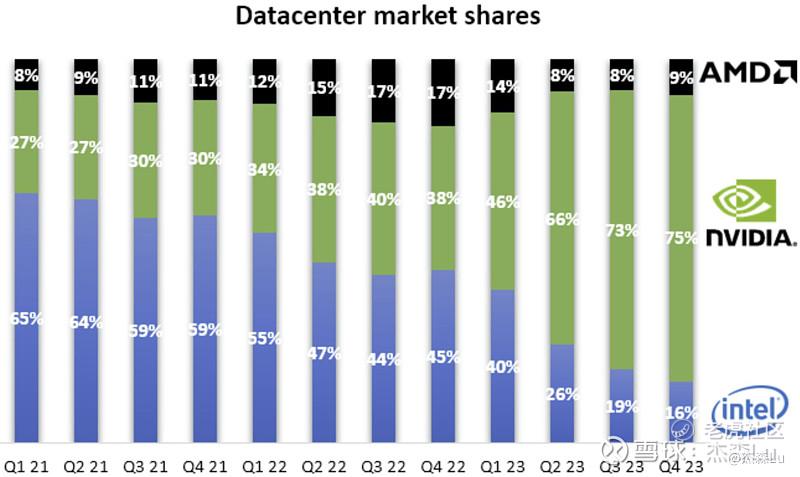 我之前讲过,今年1月份跟英伟达首席建筑师Nick Triantos聊天,他说: Jensen Huang的眼光和大局观在科技圈属于佼佼者,现在你看到的东西,其实英伟达5-8年前就开始做了,其他公司在短时间内很难追上。作为英伟达在数据库收入的竞争对手, $美国超微公司(AMD)$ 和 $英特尔(INTC)$ 最近也在奋起直追,但市场份额已经被英伟达吃掉大半(30%到75%),他们俩的芯片现在还在画大饼阶段,到现在还没有看到对英伟达的芯片有任何实质性威胁。