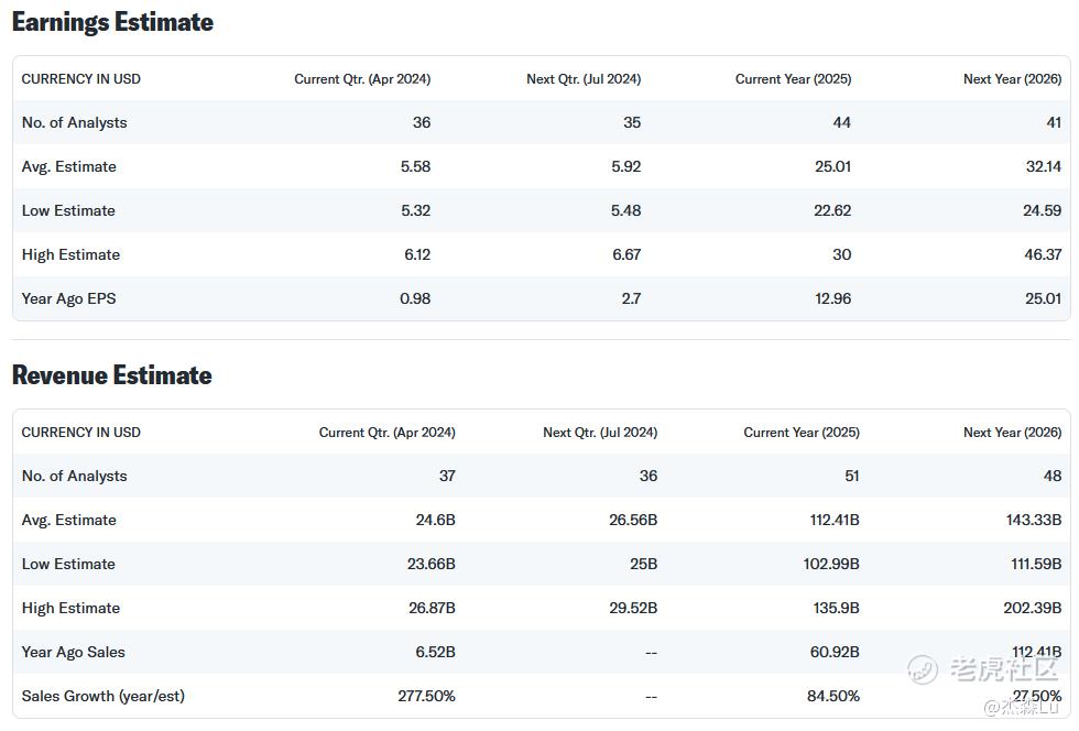 英伟达即将在本周三下午公布一季度财报,华尔街预期$5.57 EPS 和 $24.57B的营收, 二季度指引 $5.92 EPS 和$26.57B的营收,FY25全年展望$25 EPS (93%年增长), $112.36B (84.5%年增长)。由于四季度财报的超预期,分析师们最近三个月上调了20%的增长预期,这也让英伟达这次财报超预期的难度增大。