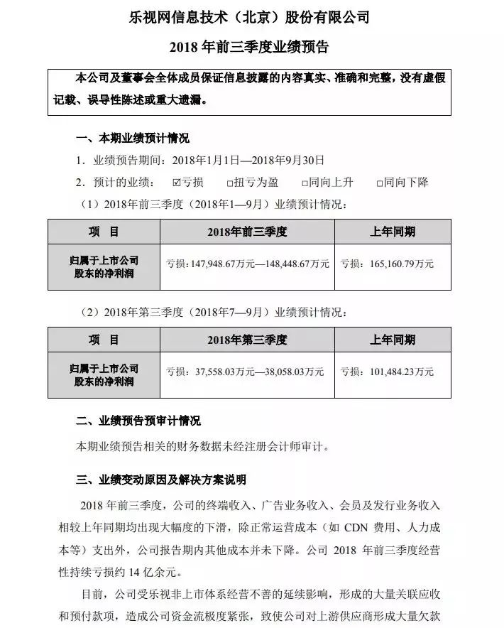 在业绩预告的公告中,乐视网点出2018年前三季度,公司的终端收入、广告业务收入、会员及发行业务收入相较上年同期均出现大幅度的下滑,除正常运营成本(如CDN费用、人力成本等)支出外,公司报告期内其他成本并未下降。