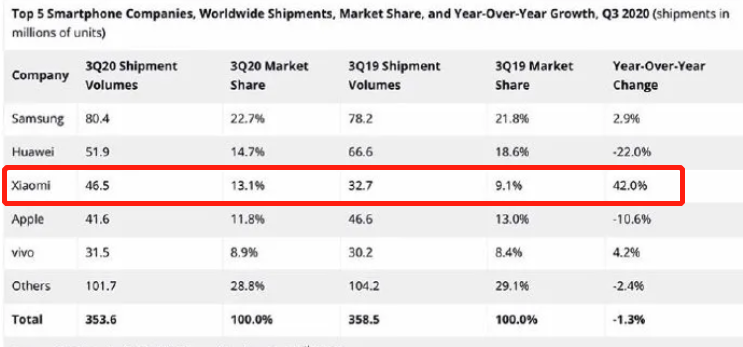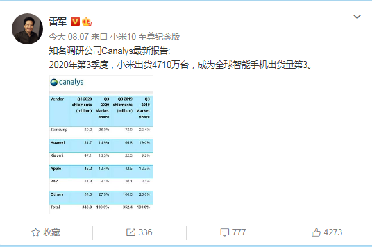 今日上午,雷军:小米重返全球智能手机出货量前三!