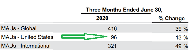 • 用户增长的同时,营收也增长58%,达到4.43亿美元。其中美国营收增长49%,至3.74亿美元,国际营收增长145%,至6900万美元。