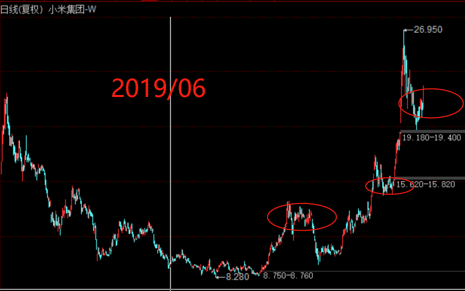2019年6月之后,下面几个红框内,看似的买点,也都是不佳的择时。那么,小米的最佳择时区在哪里?