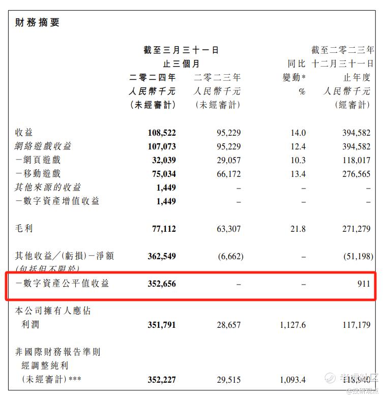 博雅互动一季度业绩公告显示,今年一季度该公司已持有约1,194枚比特币,平均成本约43,100美元/枚,持有约15,182枚以太币,平均成本约2,756美元/枚;数字资产公平值约为人民币1,063.3百万元,主要包括比特币、以太币及泰达币;录得数字资产公平值收益约为人民币3.53亿元(折合约3.80亿港币)。