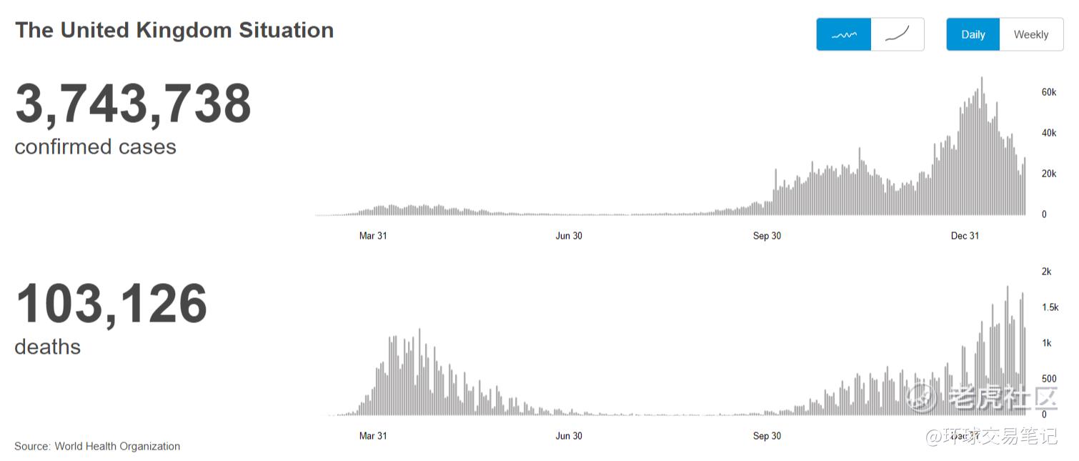 去年底的第二波变异病毒,其发源地正来自欧洲,病毒首先是从英国开始传播,在世界卫生组织的官网上,英国一月初的确诊人数来到最高峰。鉴于英国和欧盟国家的频繁联系,病毒也很快的扩散到其他欧洲国家。