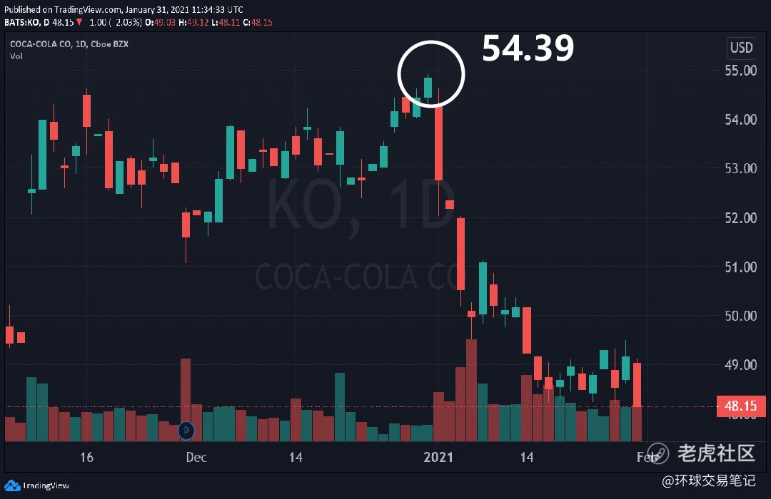 然而这两年可口可乐却好景不长,去年才因为疫情而重挫,今年一月份股价又再次败在疫情之手。去年12月份,可口可乐股价一度来到54.39元美元,眼看就要突破前高继续引吭高歌,却在成功前功亏一篑!现在,可口可乐股价已经跌至48.15美元,一月份单月跌幅高达12.20%。