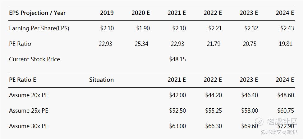 若是未来可口可乐公司经营情况稳步上升,市盈率可以保持在饮料行业的平均水平的25倍,对应2021年、2022年股价分别为52.5美元和55.25美元。和去年的高位股价非常接近。