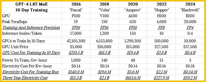 黄仁勋没有展示的是,每一代需要多少 GPU 来运行 GPT-4 1.8T MoE 基准测试,以及这些 GPU 或电力在运行时的成本是多少。因此,我们根据黄所说的需要大约 10,000 个 B100 来训练 GPT-4 1.8T MoE 大约十天,制作了一个电子表格: