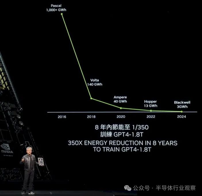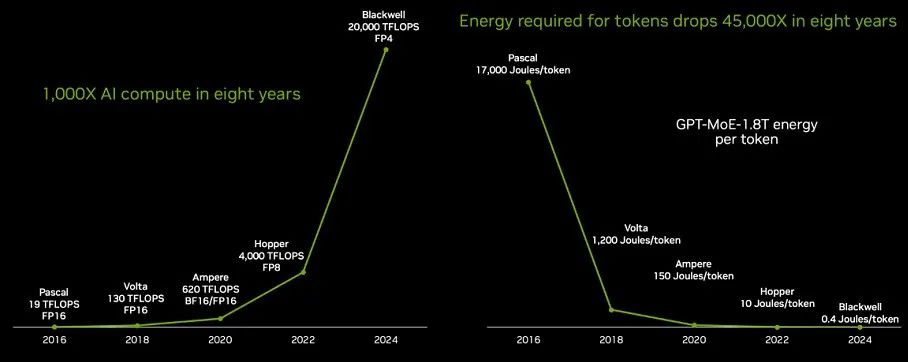 要实现 ChatGPT 的突破,需要大幅提高 GPU 的性能,然后在此基础上增加大量 GPU。Nvidia 确实实现了性能,这对于 AI 训练和推理都很重要,而且重要的是,它大大减少了生成大型语言模型响应中的 token 所需的能量。请看一看: