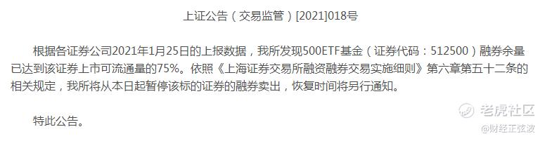 今天一开盘三大股指就都出现了下跌,市场情绪突然转冷。转冷的消息可能和下面这则新闻有关系。上交所1月26日发布公告称500ETF(512500)融券卖出的量太多了占到了流通量的75%,所以现在暂停512500的融券卖出。