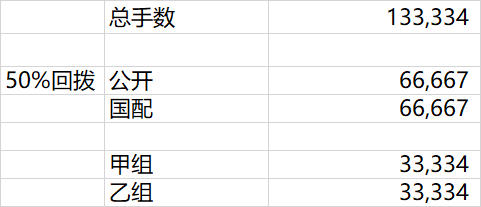 由于贝康一手金额比较大,货也特别少,在50%回拨的情况下,甲组乙组各33334手。