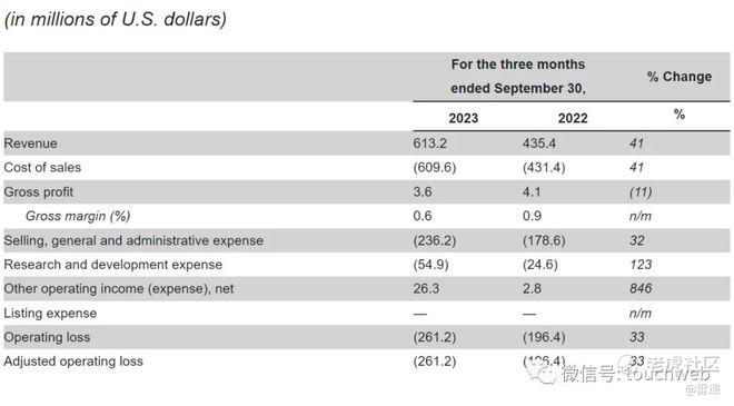 极星汽车在2023年第三季度运营亏损为2.61亿美元,较上年同期的运营亏损1.96亿美元增长33%。
