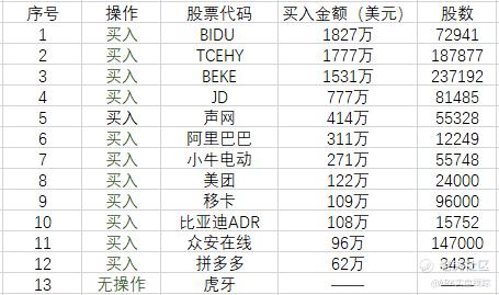 其中买入金额最大的是百度,买入金额约为1827万美元;其次是腾讯和贝壳,买入金额分别为1777万美元和1531万美元。