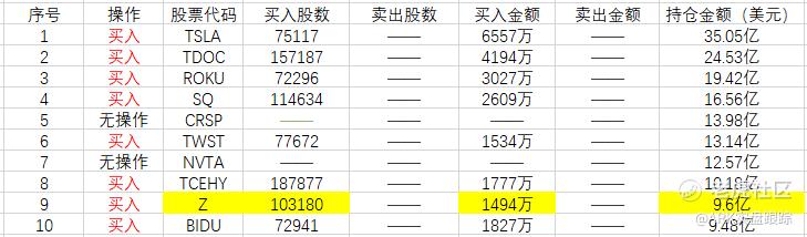 其次,在最近一周没有大仓位操作的TDOC、ROKU、SQ个股上也大手笔买入,金额分别约为4194万美元、3027万美元和2609万美元。