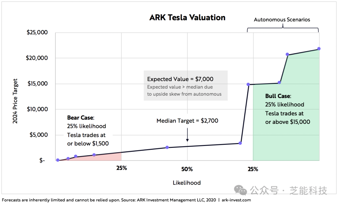 根据ARK的详尽模型分析,特斯拉未来的股价走向存在乐观与悲观两种情景,乐观情况下可触及3100美元的高点,而即使在较为保守的悲观预测下,股价也能维持在2000美元,显示出市场对方舟预测范围的广泛认同。