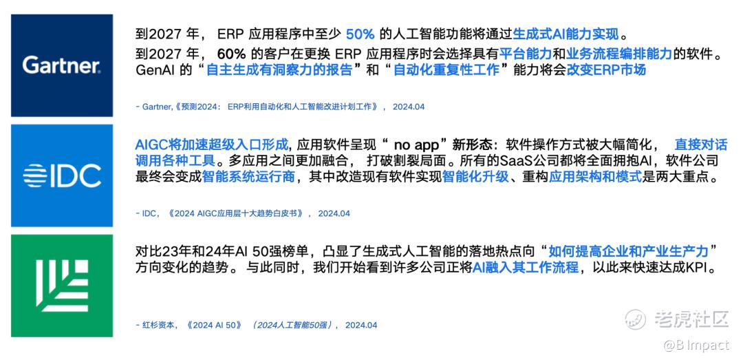 Gartner\IDC\红杉资本等海外研究机构给出了一定的答案。Gartner在2024年4月《预测2024:ERP利用自动化和人工智能改进计划工作》中预测,到2027年,ERP应用程序中至少50%的人工智能功能将通过生成式AI能力实现。