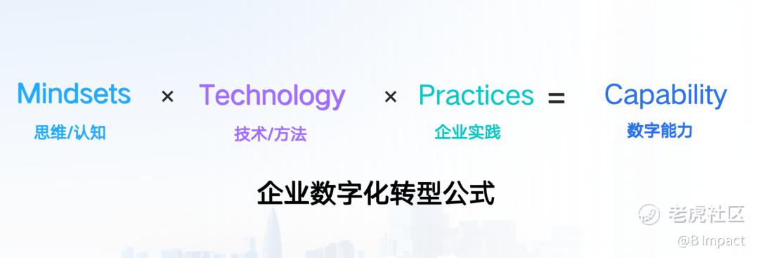其次,AI时代企业数字化转型的根本要掌握系统性转型方法。企业在数字化转型和建设的过程当中,看到问题只针对局部问题做数字化是不行的。完整的转型思路则是从企业自己的思维认知、技术方法、实践方面思考——思维认知×技术方法×企业实践,最终能构成企业的数字能力。
