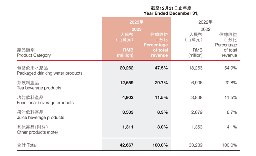 在2023年的年报,饮用水的营收占比,历史第一次下降到50%以下。得益于茶饮料的增速惊人。