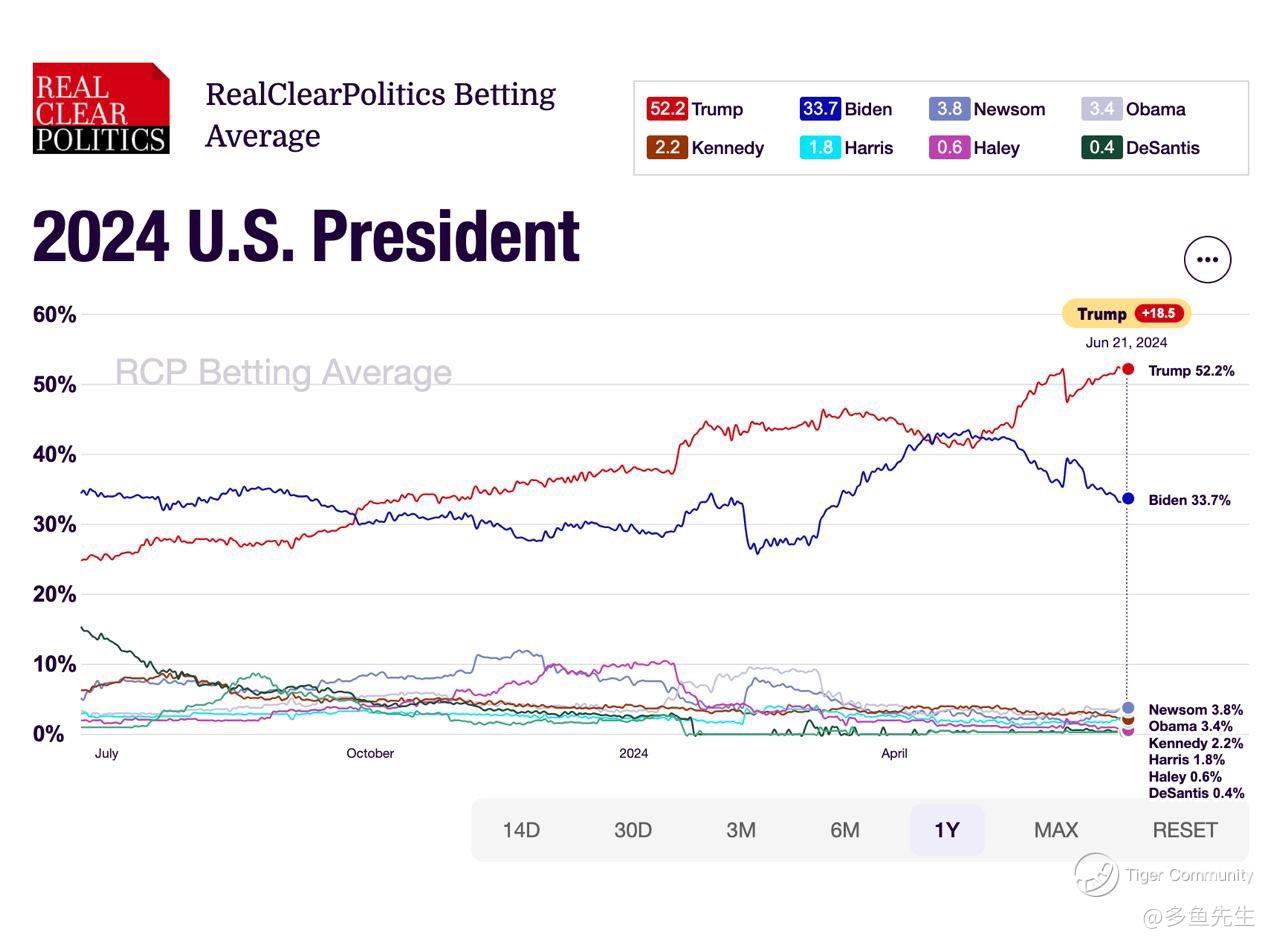 With a 52.2% betting average, Trump has gained 18.5 points, now leading Biden by a substantial margin. This trend could benefit sectors that typically perform well under Republican administrations, such as energy, defense, and financial services.