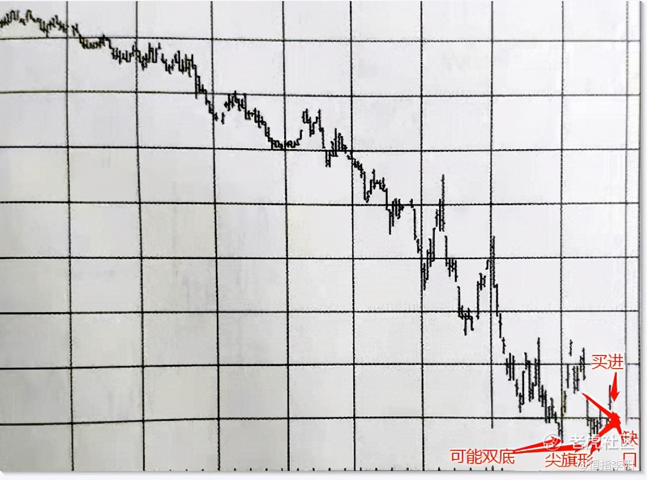2.在缺口上方出现了与尖旗形巩固预期相反的向上突破,这是可能形成双底的第个确认信号。