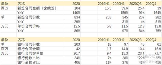 公司2020年是正式进入银行客户运营的元年,银行合同金额占比大幅提升,2020年已经提高到40%。整体新签合同量价齐升,价的提高也是主要由于高客单价的银行客户贡献为主。
