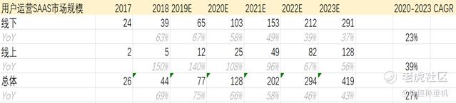 线上企业用户运营SAAS渗透率预计由2018年1.1%升到2023年18.7%。线下企业用户运营SAAS渗透率预计2018年3.4%升到2023年19.3%。驱动因素是线上流量大盘触顶,获客成本攀升,商户的营收增长主要靠存量客户的增购和复购驱动。线下商户能够在运营活动中对客户进行留存,并且能够有更多的场景数据对用户进行分析。