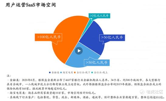 银行客户方面,根据保监会数据,2020年有4607家银行类的金融机构,一二线城市分行都有独立线上运营权,金融市场规模达到50亿元。淘宝电商商家有10万家,市场空间预计50亿元。线下零售市场预计100亿元。用户运营本来是一个标准化低的行业,在海外也没有对标SAAS公司,所以这片市场还是属于一个细分的蓝海市场。