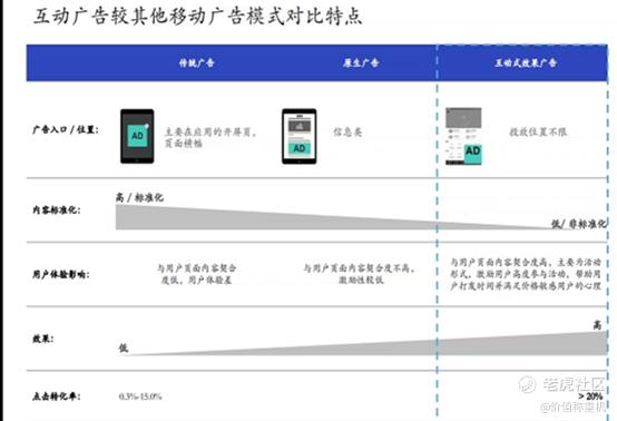 互动效果广告是移动广告市场的一个细分赛道,通过一种奖励式或者趣味式的方式吸引用户参与,从而实现拉新和留存。和传统广告相比,互动式广告在用户参与度、广告效果和转化率方面表现更好,以点击转化率作为指标,传统广告一般在0.3% - 15%,而互动型广告可以高达20%以上。