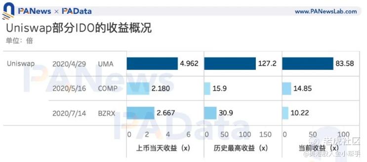 从历史最高收益来看(以Uniswap历史交易的最高价为准),Uniswap上IDO的三种代币的平均收益倍数达到惊人的57.99倍,这主要受到UMA IDO高达127.2倍这一极端值影响,那么另外两种代币的平均收益倍数约为23.41倍,也非常高。