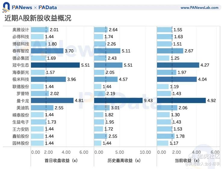 这里还统计了2月以来A股新股的「打新」收益,结果显示,17支新股平均首日收盘涨幅约为1.73倍(中位数),其中最高的冠中生态也只有5.51倍。平均历史最高收益约为2.26倍,其中最高的曼卡龙约有9.43倍。平均当前收益只有1.55倍,其中仅冠中生态、极米科技和曼卡龙超过4倍。