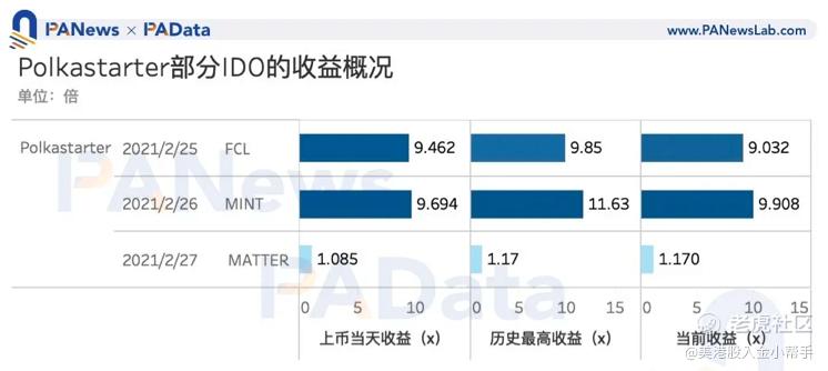 Polkastarter上IDO的三种代币的平均收益倍数则要低很多,大约7.55倍,略高于首发当日。整体平均历史最高收益约为13.80倍(中位数)。