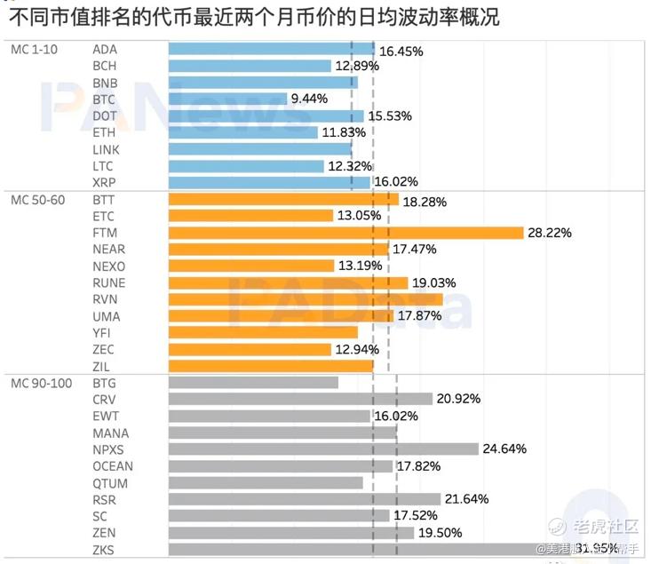 今年以来,30种不同市值排名的数位货币的日均波动率约为16.27%(中位数),其中市值排名1-10位的数位货币的日均波动率最低,约为14.51%,市值排名90-100的数位货币的日均波动率最高,约为18.10%。远低于近期IDO代币的波动率。