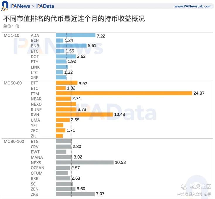 其他数位货币今年以来的持币收益,结果显示,抽样的30种数位货币今年以来的平均持币收益约为2.74倍(中位数),其中市值排名90-100的数位货币今年以来的平均持币收益最高,约为2.81倍(中位数),市值排名1-10位的数位货币今年以来的平均持币收益最低,仅约为1.92倍(中位数)。