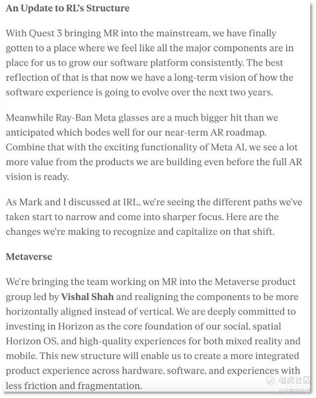 从Andrew Bosworth的内部信可见,智能眼镜、可穿戴设备、AI成为关键词。而Quest系列头显、元宇宙社交平台Horizon等Reality Labs的传统业务线不再突出。