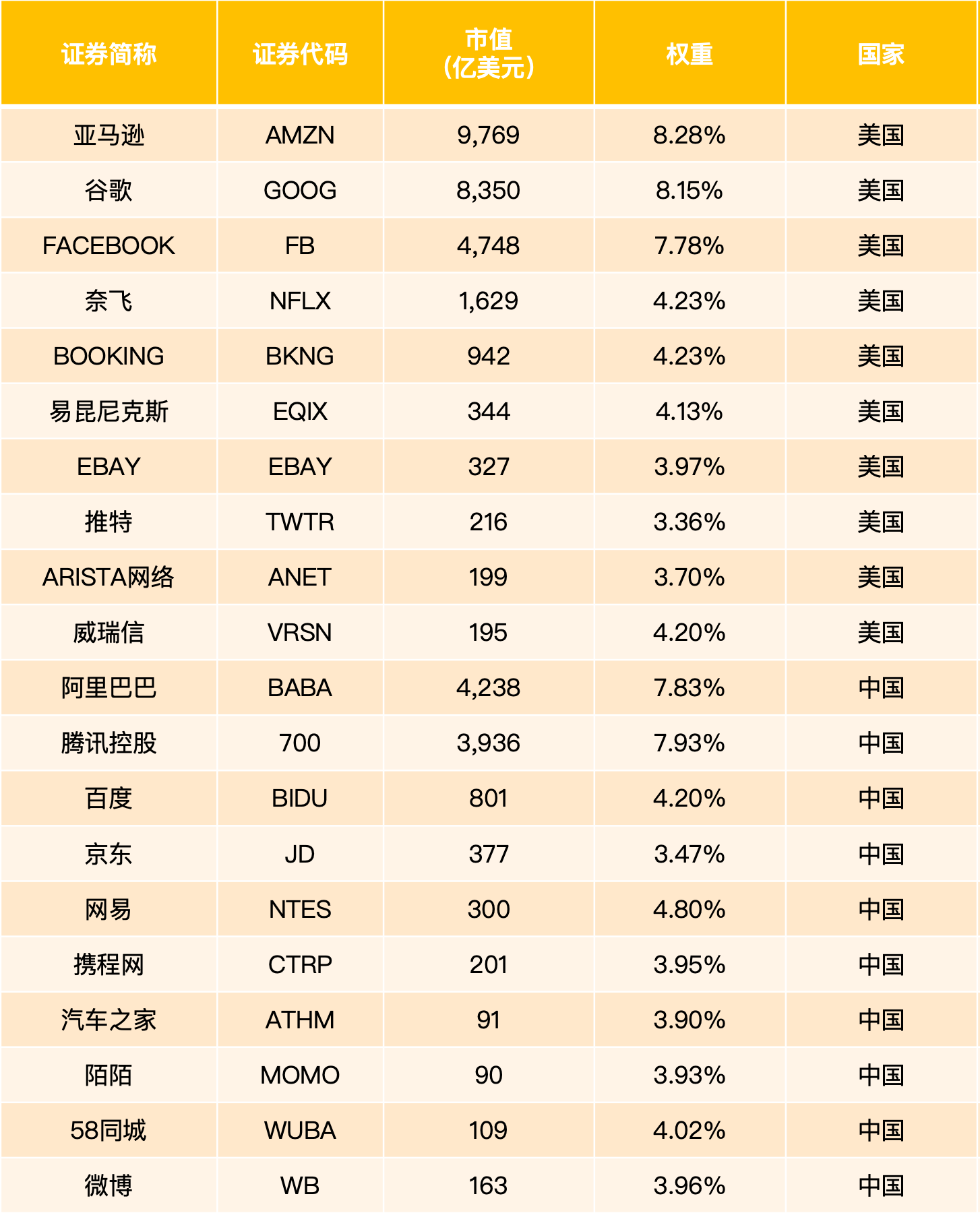 3)10只市值最大的中国互联网公司,必须是纳斯达克全球指数(NQGI)、纳斯达克互联网指数(QNET)成分股或在美国上市的中国公司;