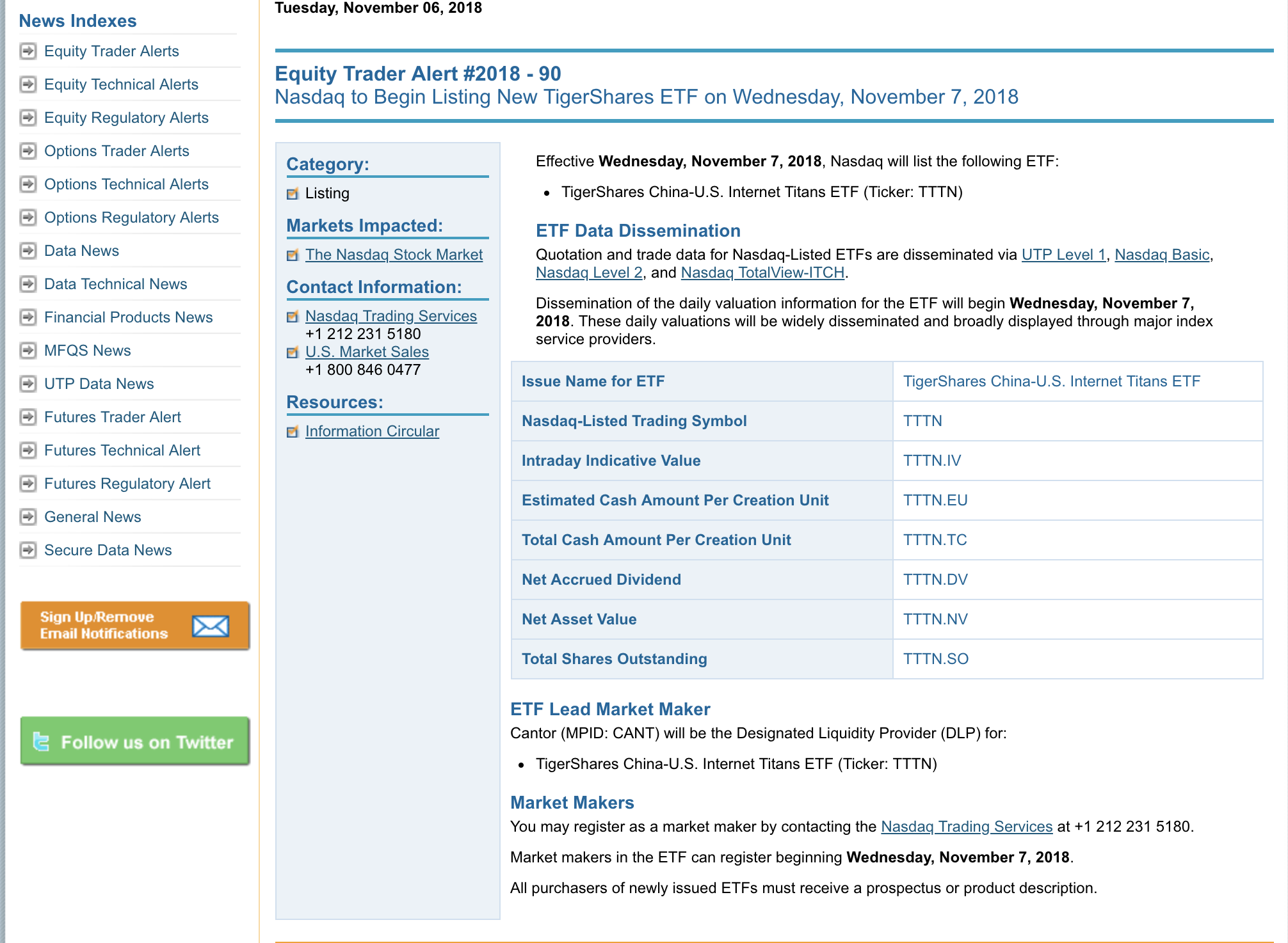 今晚跟踪这个老虎中美互联网指数的ETF-$老虎中美互联网巨头ETF(TTTN)$ 将在纳斯达克交易所正式挂牌交易 !由 TigerShares基金发行,发行价$25,目标是紧密跟踪纳斯达克中美互联网老虎指数,追求跟踪偏离度及跟踪误差的最小化。(庆 TTTN 成功挂牌,在老虎交易该ETF免佣金哦~)点击查看!(图为纳斯达克官网通知 TTTN今晚挂牌)