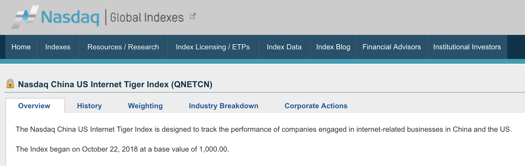 这个指数起始日期为2018年10月22日,基础价值为1000。(图为Nasdaq官网关于QNETCN的介绍)