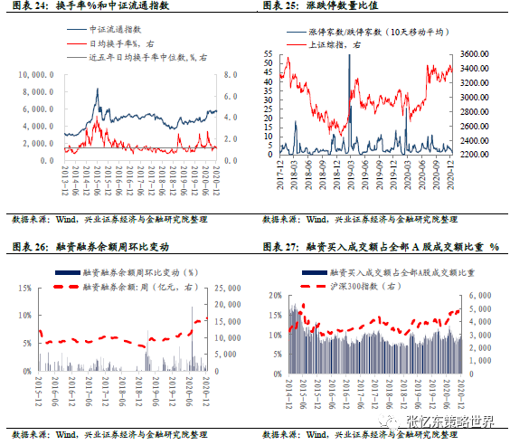 换手率:A股日均换手率从上周的1.17%下降至1.11%,低于近五年以来的中位数水平;截至12月18日,涨停家数/跌停家数比(10日移动平均)为1.4,处于2013年以来的14%分位数水平。