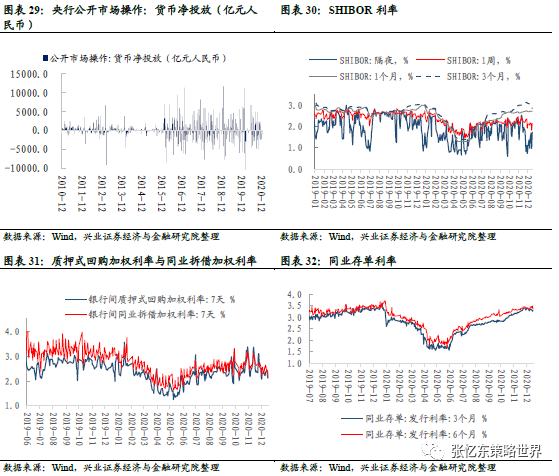 货币市场利率:截至12月18日,相较于上周五,SHIBOR隔夜利率上升29.2bp至1.72%,7天利率下降3.0bp至2.15%;SHIBOR1个月利率上升0.4bp至2.72%,3个月利率下降16.1bp至2.86%。截至12月18日,7天银行间同业拆借加权利率下降22bp至2.43%,7天银行间质押式回购加权利率下降5bp至2.29%;3个月同业存单利率下降6bp至3.22%,6个月同业存单利率下降5bp至3.34%。