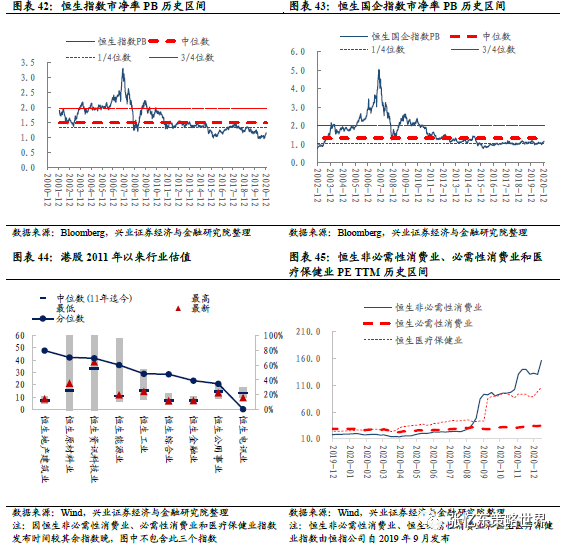截至12月18日,恒指预测PE(彭博一致预期)为14.3倍,处于2005年7月以来的3/4分位数附近;恒生国指预测PE为10.6倍,处于2005年7月以来的中位数和3/4分位数之间。