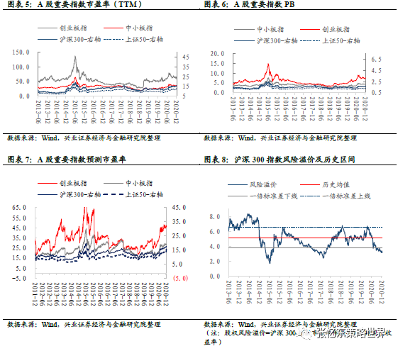 截至12月18日,沪深300、创业板、中小板、上证50PE-TTM分别为15.6倍、59.3倍、33.2倍、13.8倍,处于2011年以来的96%、77%、68%、99%分位数水平。当前沪深300、创业板、中小板、上证50的PB分别为1.7倍、7.7倍、4.5倍、1.5倍, 处于2011年以来的76%、90%、82%、74%分位数水平。