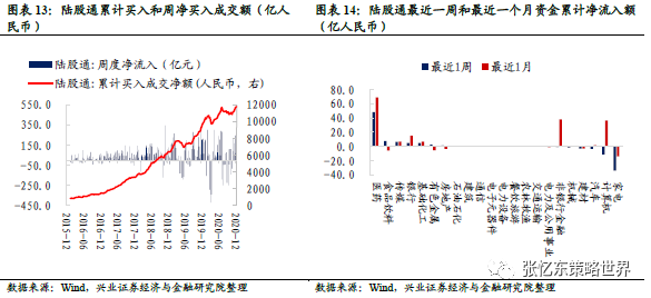 陆股通资金净流入:本周陆股通净流入84.8亿元人民币;自开通以来,陆股通累计买入成交净额11802亿人民币。北向资金本周主要流入医药、食品饮料和传媒,流出家电、计算机和汽车。