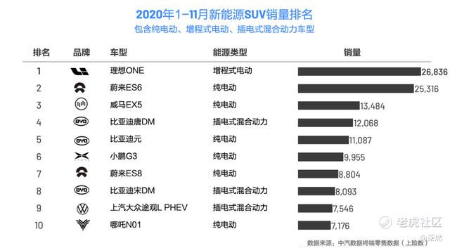 乘联会数据显示,今年1-11月新能源SUV销量榜中,理想ONE排名第一,蔚来ES6排第二,威马EX5排第三。
