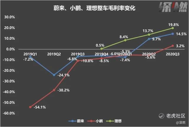 小鹏的整车毛利率在今年三季度首次转正为3.2%,蔚来在二季度就转正为9.7%,理想则在去年四季度就是0.5%,一开始就是正的。