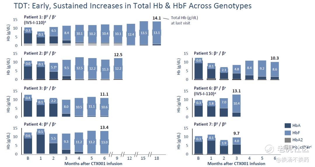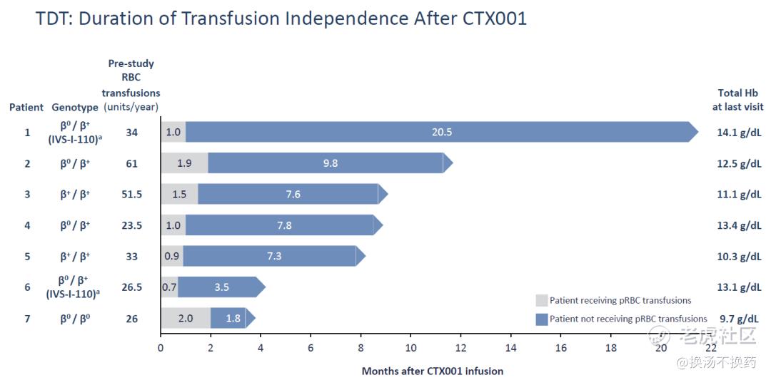 在接受治疗之前,7位患者均需要接受定期输血治疗,且每年输血次数在20次以上,最多的一位患者一年需要输血高达61次,在接受CTX001治疗的2个月后,7位患者均摆脱了对输血的依赖。