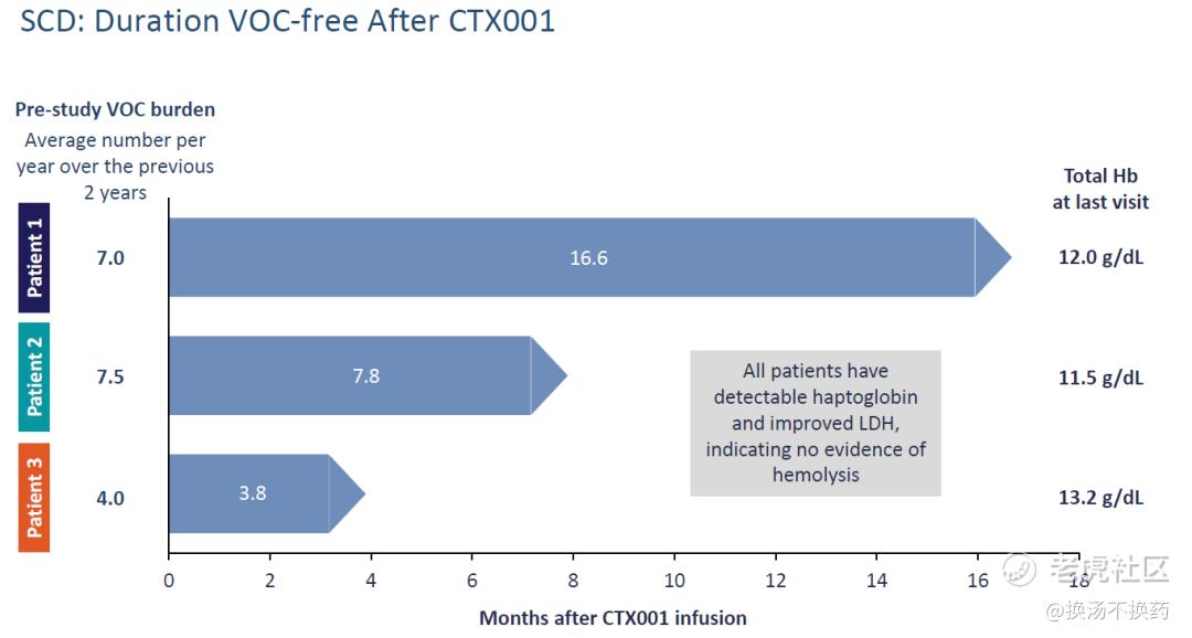 在接受CTX001治疗前,3位患者在过去两年平均每年要发生4-7.5次血管堵塞(血管闭塞危机,VOC),但在目前的治疗中(最长16.6个月),3位患者没有发生过1次血管堵塞。