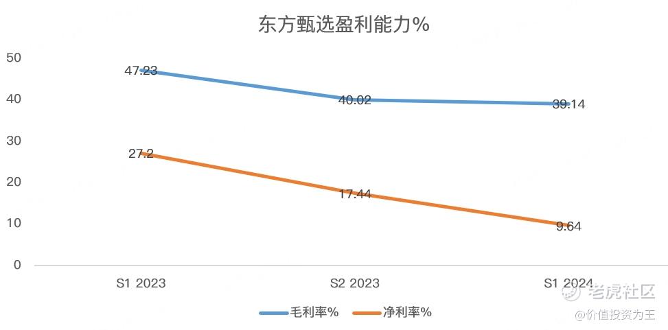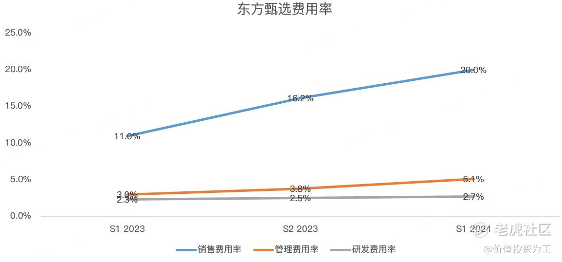 费用率方面,东方甄选在2024上半财年加大了销售费用投入,费用率达到了20%,远高于当初爆火时的11%,严重拖累了净利率: