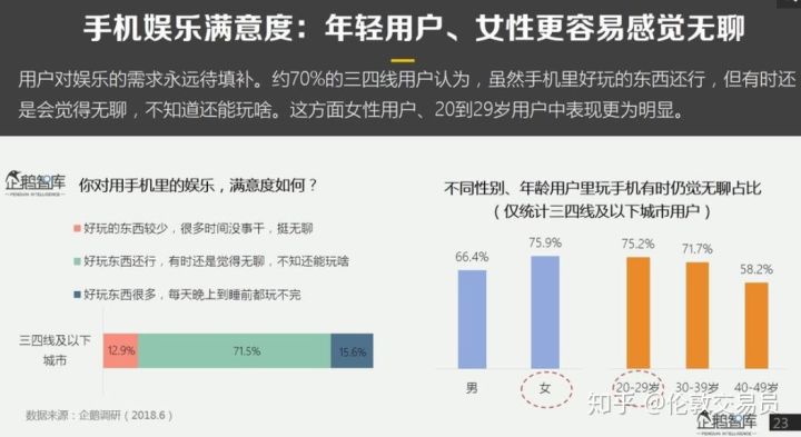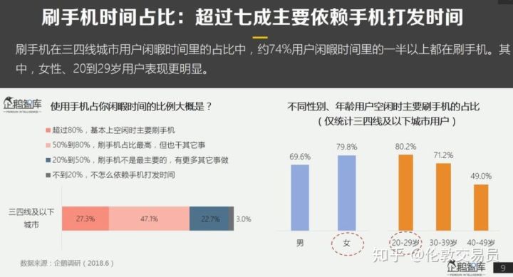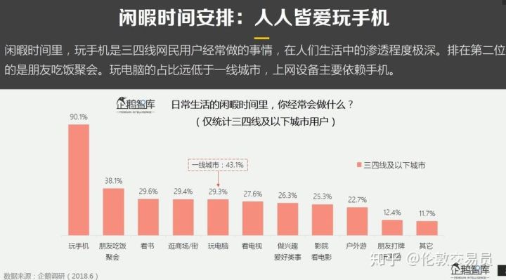数量庞大的'小镇青年'对kill time(消磨时间)的偏好要远大于save time(节省时间)。74%的三四线城市用户的大部分闲暇时间都在刷手机,尤其是女人和年轻人,刷手机已接近于上瘾。