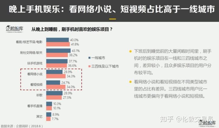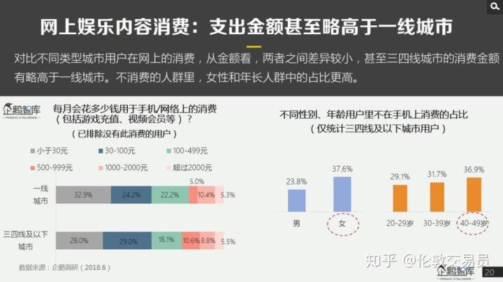 而且,三四线城市的手机用户不仅消耗了更长的时间在网络小说和短视频,还支付了更多的线上娱乐金额。