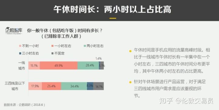 相比起中午紧张忙碌的一二线白领,超过50%的三四线居民的午休时间超过了2个小时,该场景非常适于手机端的资讯类和短视频App。
